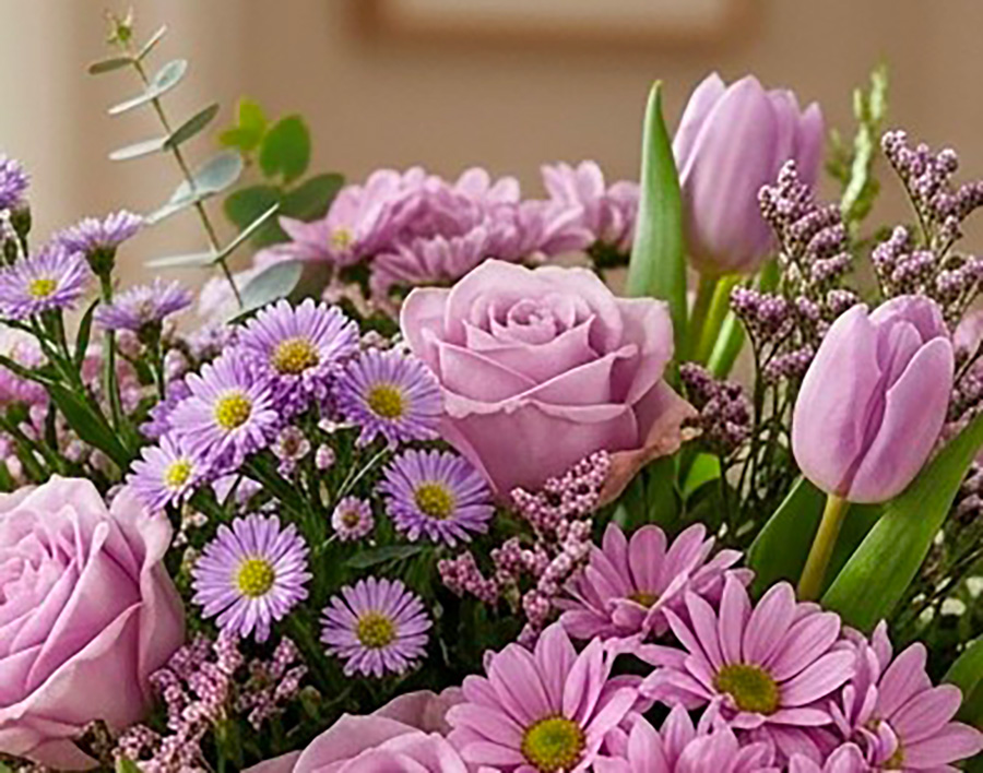 Une harmonie de tons lilas composée de roses, de chrysanthèmes, de tulipes, d’asters et plus encore.
